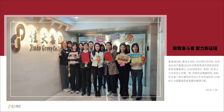 春潮涌动处,奋进正当时。2026年1月29日、30日佳大地产集团2025年优秀奖项评优颁奖活动在各项目隆重举行。公司领导班子、各部门负责人与全体员工齐聚一堂,共同见证荣耀时刻,表彰在过去一年中涌现的杰出人才与忠诚伙伴,以榜样之力凝聚高质量发展的磅礴之势。